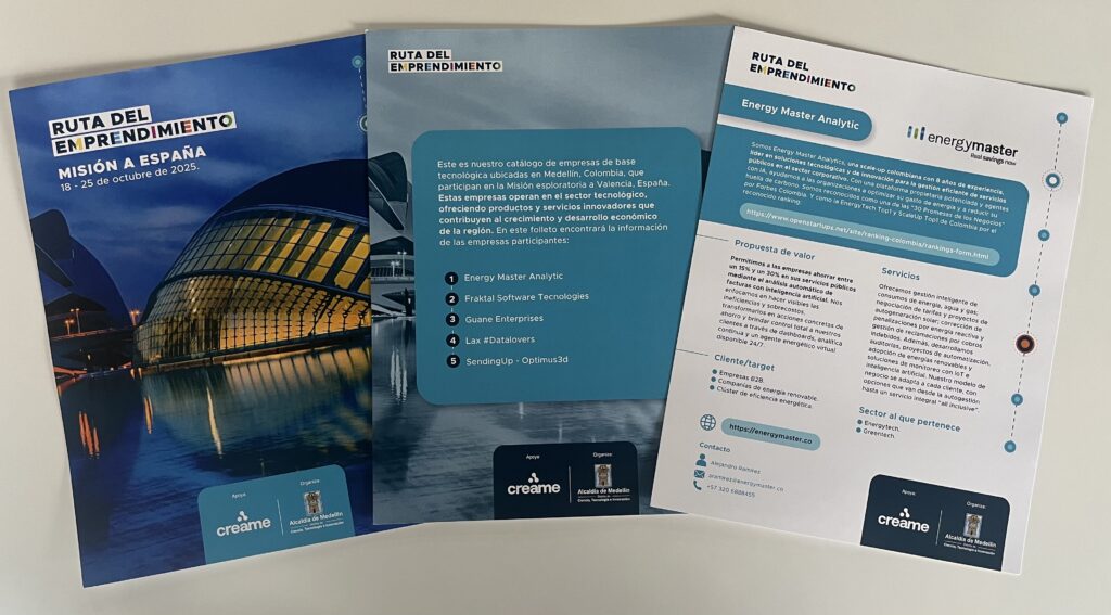 Energy Master ha sido seleccionada para participar en la Ruta del Emprendimiento – Misión España, una iniciativa estratégica que impulsa la visibilidad global del talento innovador de Medellín. Del 18 al 25 de octubre, la compañía representará a Colombia en Europa con una participación destacada en el Valencia Digital Summit 2025, uno de los eventos tecnológicos más influyentes del continente.